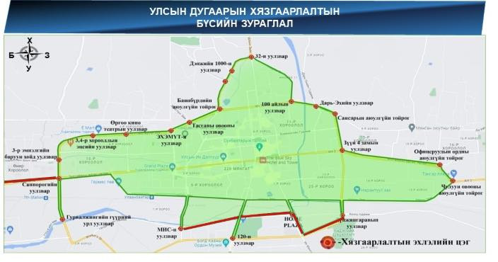 Бүсчлэлийн хувьд таван шарын уулзвар, чулуун овооны уулзвар, 32-ын тойргийн уулзвар, МИС-ийн уулзвараас 19-ын үйлчилгээний дунд голын зам, Гандигын гудамж, И мартын уулзвар хүртэл хязгаарлана. Хязгаарлалтын 6 хоногийн хугацаанд иргэд та бүхэн цагдаагийн алба хаагчдын шаардлагыг хүлээн авч, соёлтой байхыг хүсье.