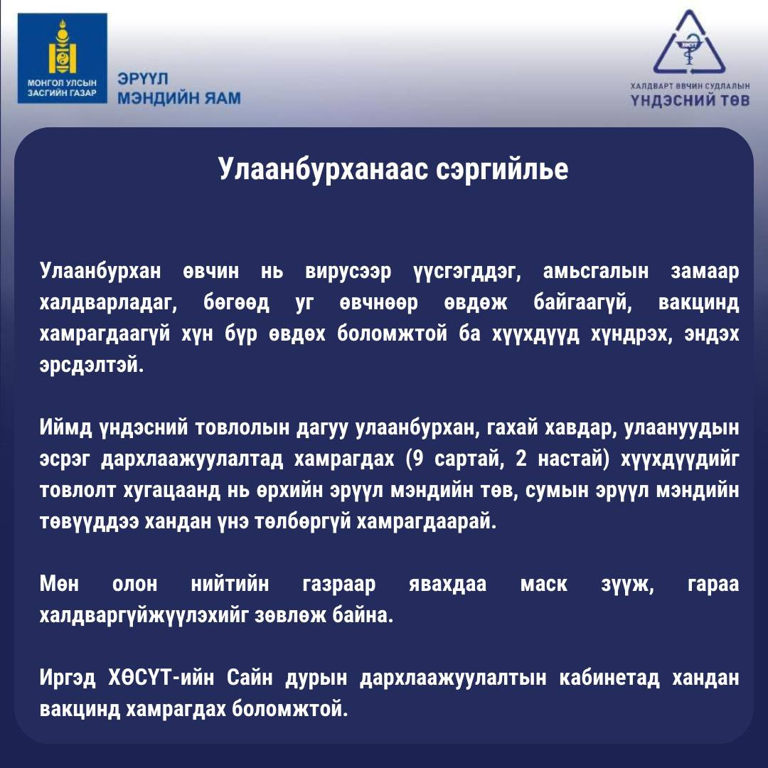 Мөн олон нийтийн газраар явахдаа маск зүүж, гараа халдваргүйжүүлэхийг санууллаа. ХӨСҮТ-ийн Сайн дурын дархлаажуулалтын кабинетад хандан вакцинд хамрагдах боломжтой юм.