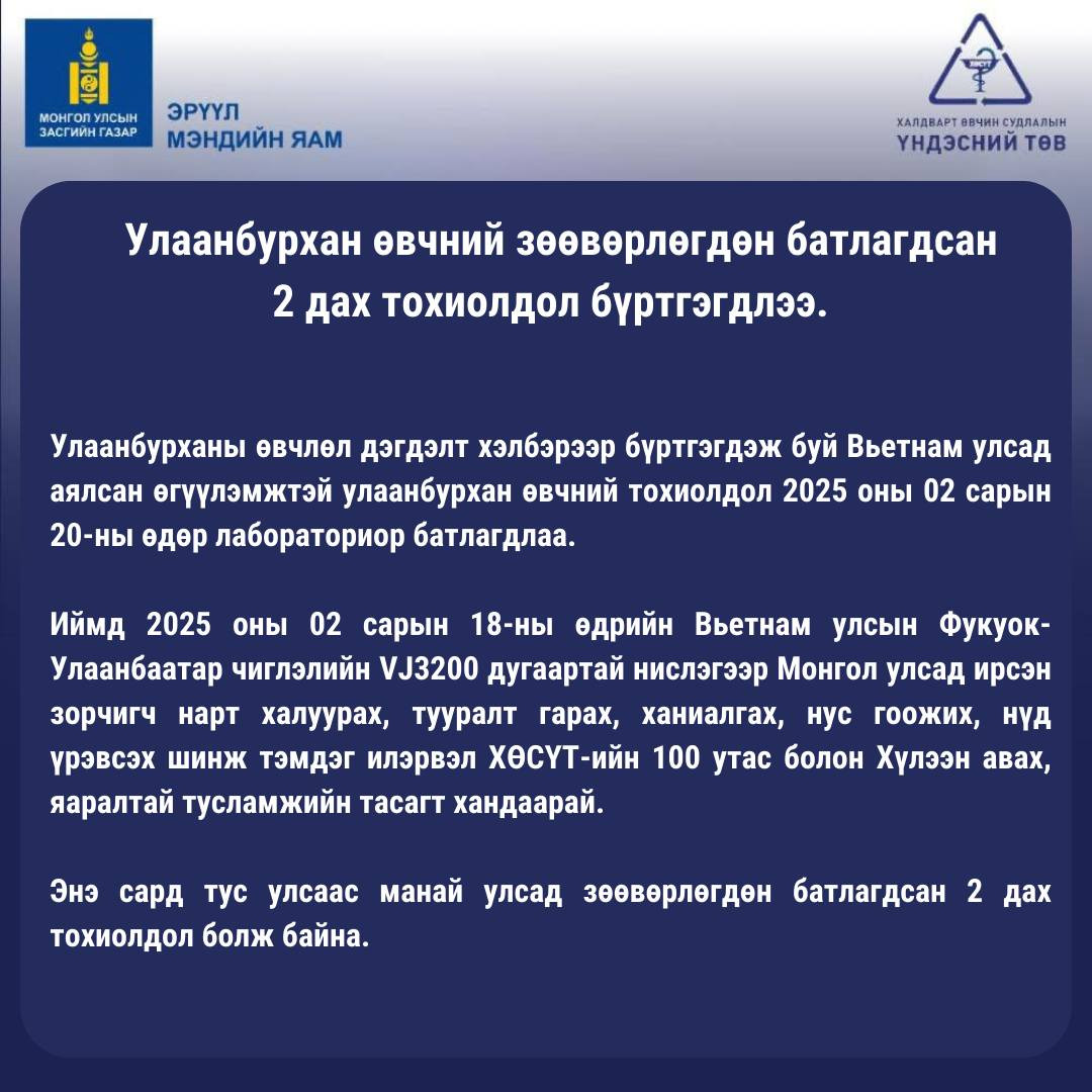 Хоёрдугаар сарын 18-ны өдрийн Вьетнам улсын Фукуок-Улаанбаатар чиглэлийн VJ3200 дугаартай нислэгээр Монгол улсад ирсэн зорчигч нарт халуурах, тууралт гарах, ханиалгах, нус гоожих, нүд үрэвсэх шинж тэмдэг илэрвэл ХӨСҮТ-ийн 100 утас болон Хүлээн авах, яаралтай тусламжийн тасагт хандахыг анхаарууллаа.