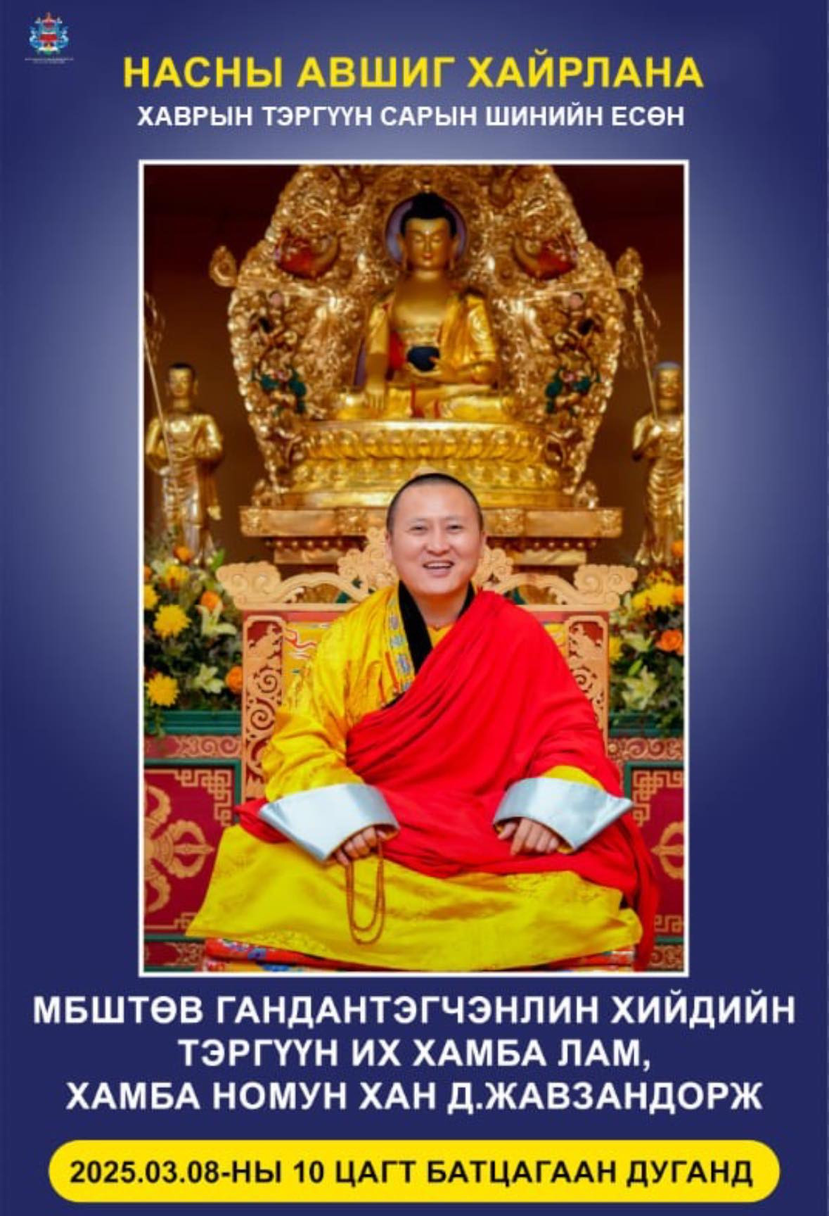 МБШТ– Гандантэгчэнлин хийдийн тэргүүн их хамба лам, 30 дахь хамба номун хан, гэвш лхаарамба Д.Жавзандорж гуравдугаар сарын 8-ны өдөр буюу хаврын тэргүүн сарын шинийн 9-ний билэгт сайн өдөр Батцагаан цогчэн дуганд сүсэгтэн олондоо зориулан “Насны авшиг” хайрлах гэж байна.
