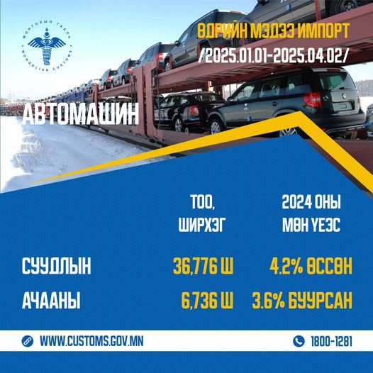Харин 2025 оны 04 дүгээр сарын 02-ны өдрийн байдлаар 6,736 ширхэг ачааны автомашин импортолсон нь өмнөх оны мөн үетэй харьцуулахад 3,6 хувиар буурсан үзүүлэлттэй байна.