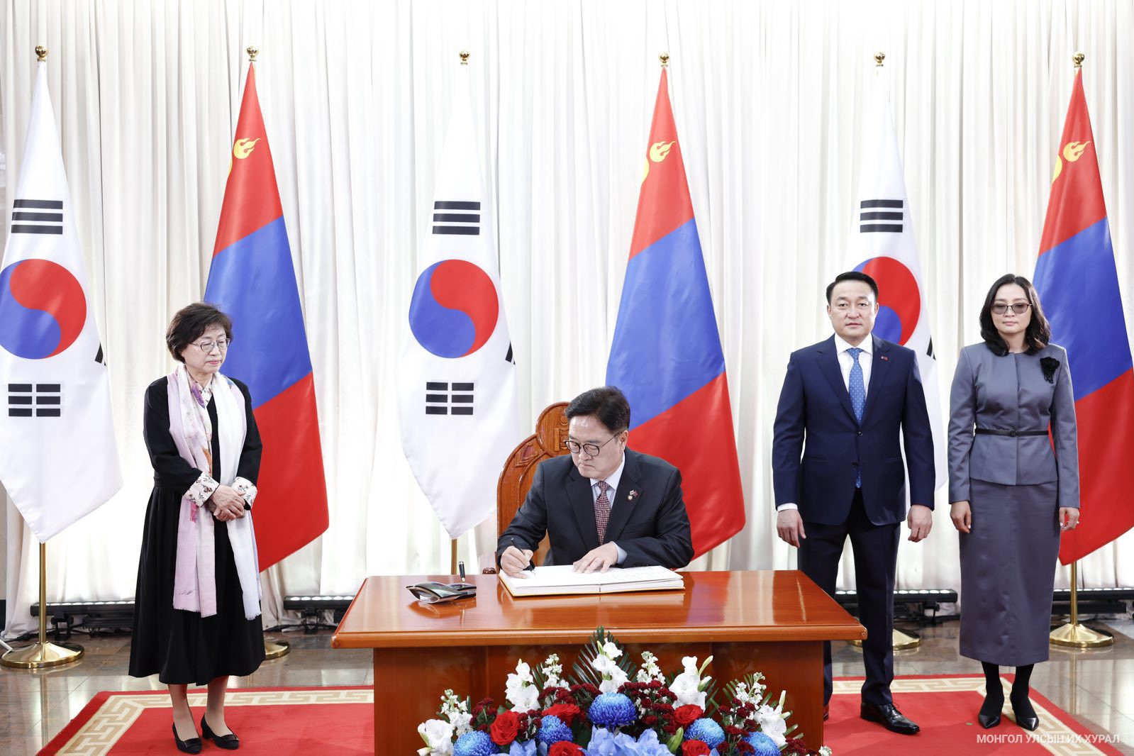 Улсын Их Хурлын дарга Д.Амарбаясгалан, гэргий Д.Бямбасүрэн нар эрхэм зочдын хамт Их Эзэн Чингис хааны хөшөөнд хүндэтгэл үзүүлсний дараа Төрийн ордны Ёслол хүндэтгэлийн өргөөний Баганат танхимд саатан, Эрхэмсэг ноён Ү Вон Шиг хүндэт зочны дэвтэрт сэтгэгдлээ үлдээн, гарын үсэг зурав.