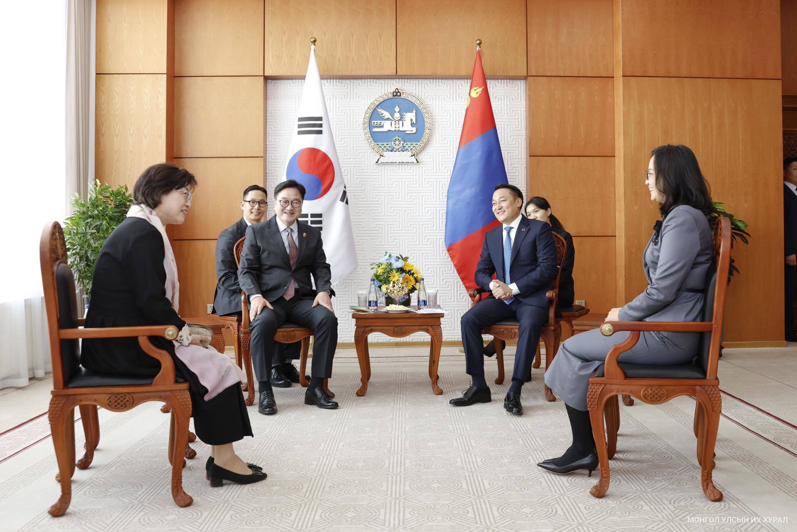 Үргэлжлүүлэн Улсын Их Хурлын дарга Д.Амарбаясгалан Бүгд Найрамдах Солонгос Улсын Үндэсний Ассамблейн дарга Ү Вон Шиг нарын уулзалт эхэллээ.