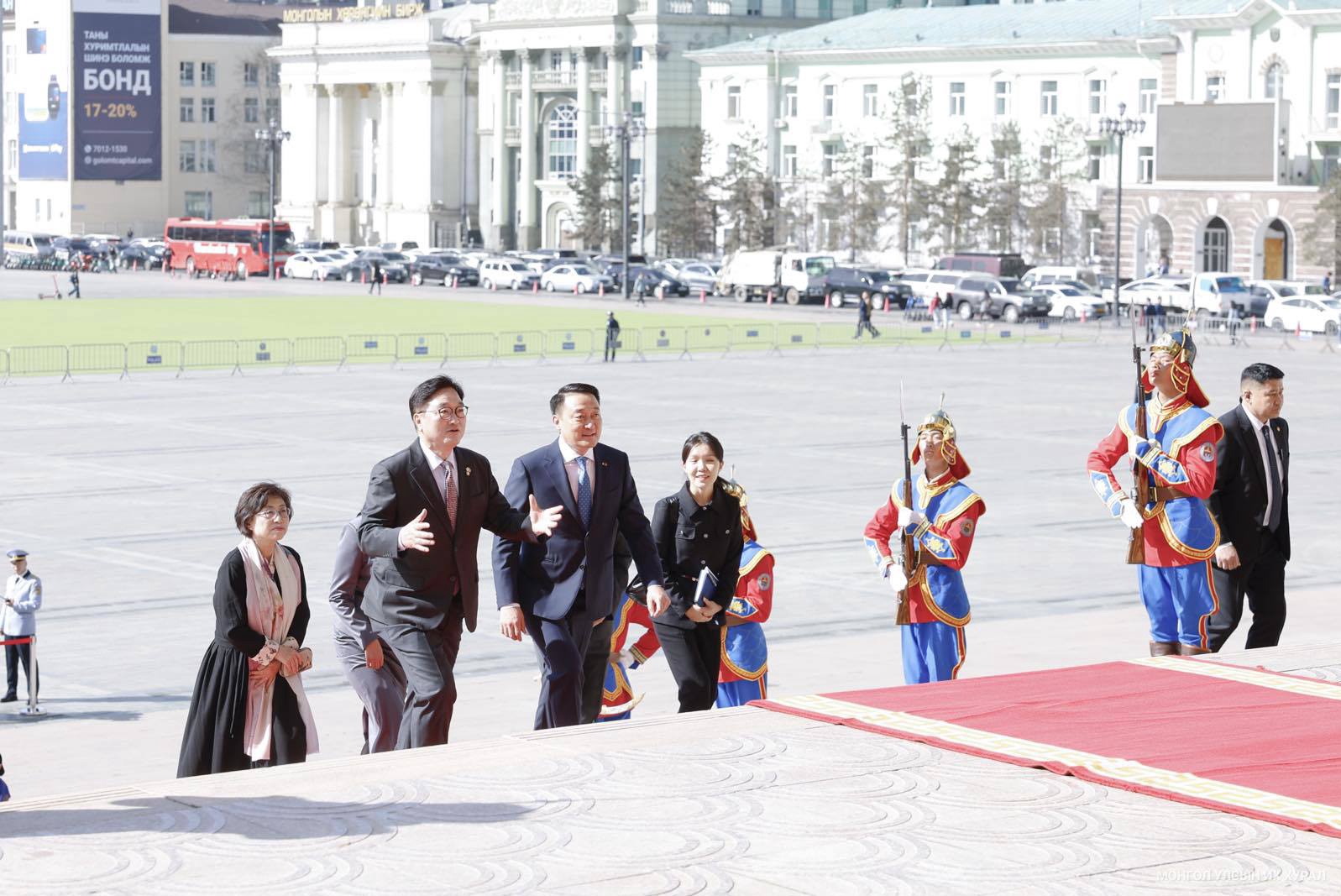 Улсын Их Хурлын дарга Д.Амарбаясгалан гэргий Д.Бямбасүрэнгийн хамтаар Монгол Улсад албан ёсны айлчлал хийж буй Бүгд Найрамдах Солонгос Улсын Үндэсний Ассамблейн дарга Ү Вон Шиг, гэргий Шин Гён Хэ нарыг өнөөдөр жанжин Д.Сүхбаатарын талбайд угтан мэндчиллээ.
