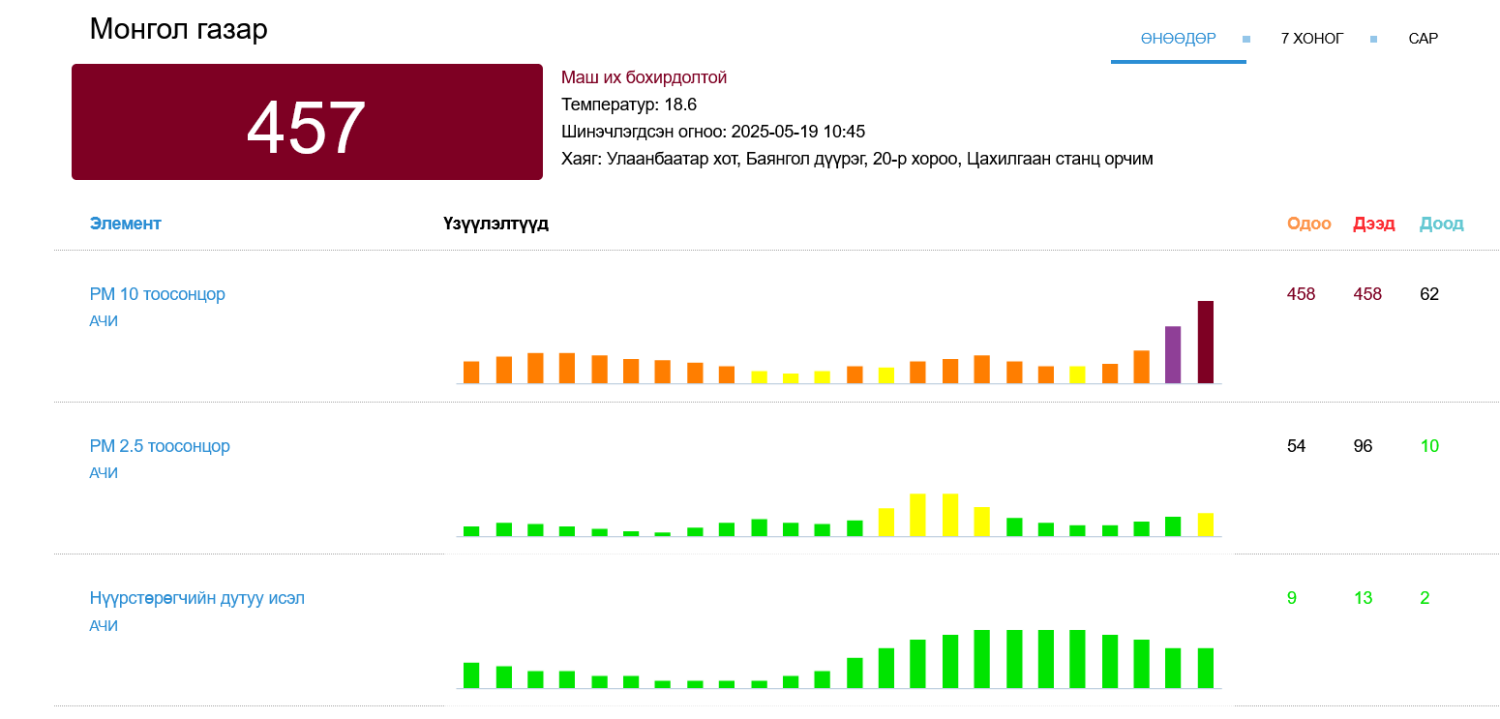 Агаарын чанарын индексийн хэмжилтийг заадаг agaar.mn сайтад мэдээлж буйгаар өнөөдөр 11 цагийн байдлаар ТЭЦ-4 станц орчмоор агаар маш их бохирдолтой байна.