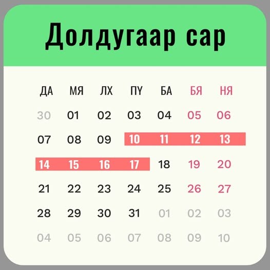 Үндэсний их баяр наадам, Ардын хувьсгалын ойн баярын өдрүүдийн 12, 13-ны өдөр нь Бямба, Ням гарагт тохиож байгаа тул 2025 оны 7 дугаар сарын 16, 17-ны өдрийн Лхагва, Пүрэв гарагт ажилтан, албан хаагчдыг амраах зохицуулалт хийхээр Засгийн газрын хуралдаанаар /2025.06.04/ шийдвэрлэсэн байна.