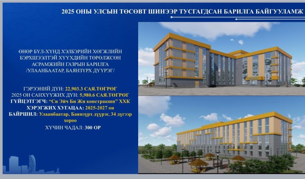 Улсын төсвийн хөрөнгө оруулалтаар асран хамгаалагчгүй, хүнд хэлбэрийн, хөгжлийн бэрхшээлтэй хүүхдийн төрөлжсөн асрамжийн газрыг 2025-2027 онд барина.
