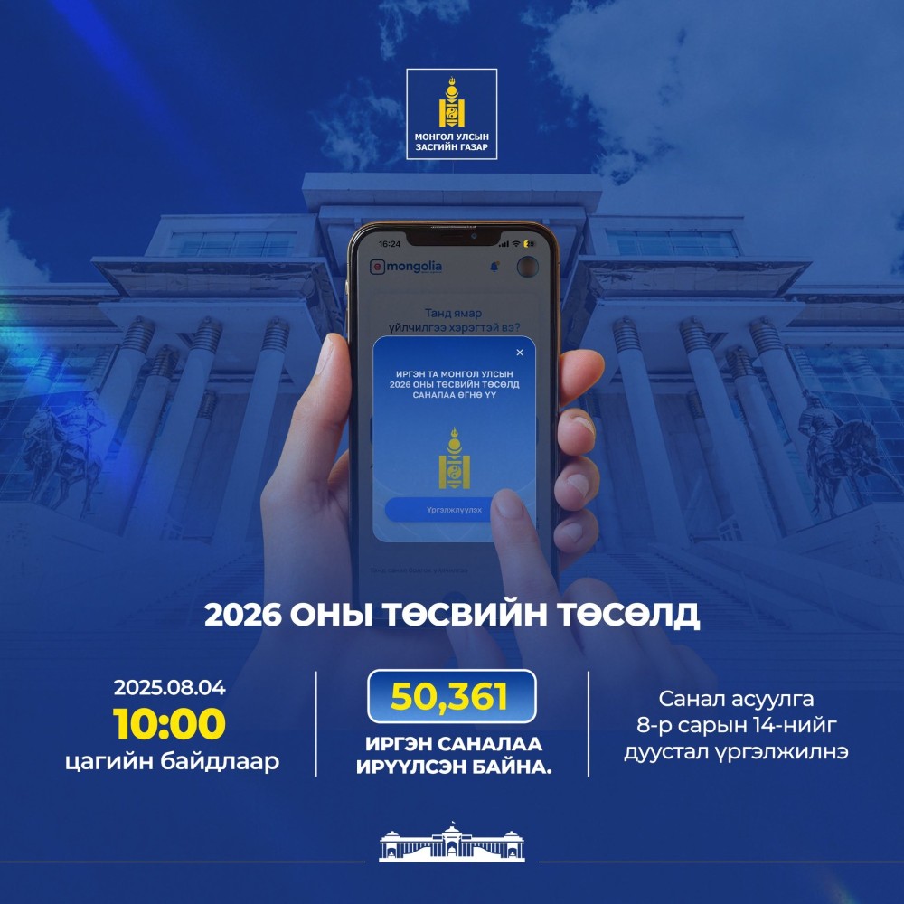 E-Mongolia цахим системээр дамжуулан төсвийн төсөлд саналаа өгсөн иргэдийн тоо 2025.08.04-ний 10:00 цагийн байдлаар 50361 боллоо. Иргэд, олон нийтээс санал авах үйл явц үргэлжилж байна.