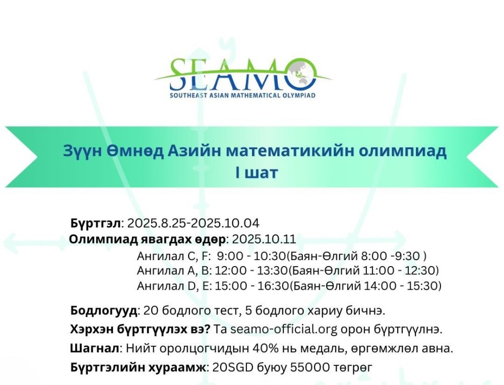 Дэлхийн 18 орны 25 мянга сурагч өрсөлддөг, олон улсын нэр хүндтэй Зүүн Өмнөд Азийн математикийн (SEAMO) олимпиадын эхний шатыг хоёр дахь удаа Монголдоо зохион байгуулна.