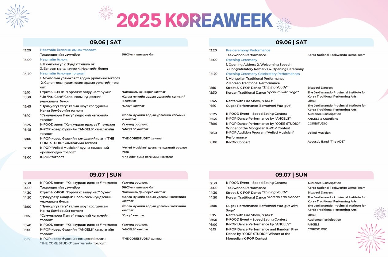 БНСУ-ын Элчин сайдын яам, Нийслэлийн Аялал жуулчлалын газраас жил бүр уламжлал болгон зохион байгуулдаг “Солонгосын соёл аялал жуулчлалын өдрүүд” арга хэмжээ энэ амралтын өдрүүдэд буюу 2025 оны 09 дугаар сарын 06-07-ны өдрүүдэд жанжин Д.Сүхбаатарын талбайд болно.
