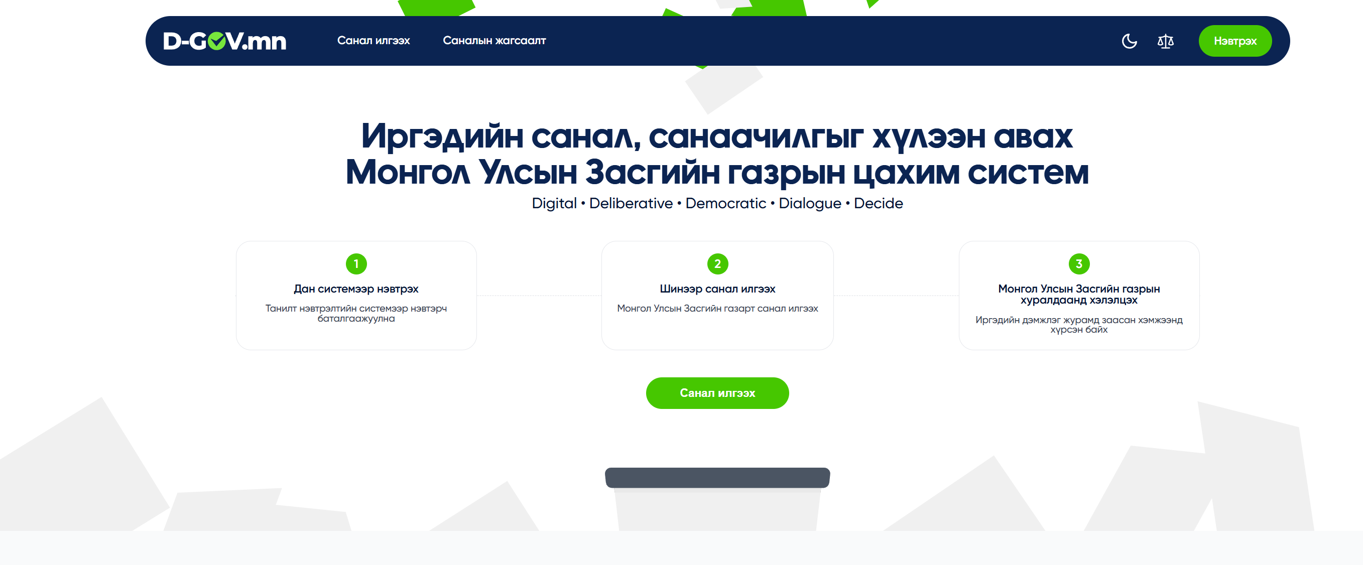 “Иргэд, олон нийтийн дэмжлэгтэйгээр нээлттэй засгийг жинхэнэ утгаар нь хөгжүүлэхээр зорьж байгаа. Энэ хүрээнд иргэдийнхээ ажил хэрэгч санал, шүүмжлэлийг хүлээн авах зоридгоор D-gov.mn цахим хуудсыг ашиглахаар шийдвэрлэлээ. Ингэснээр Засгийн газрын бодлого, шийдвэрийг төлөвлөх, иргэд болон иргэний нийгмийн байгууллагуудын саналыг авах, нийгэмд тулгамдаж буй асуудлуудаар цахим хэлэлцүүлэг өрнүүлэх, төрийн албаны үйлчилгээг сайжруулах, төрийн албан хаагчдын үнэлгээг нээлттэй ил тод болгох боломж бүрдэнэ.