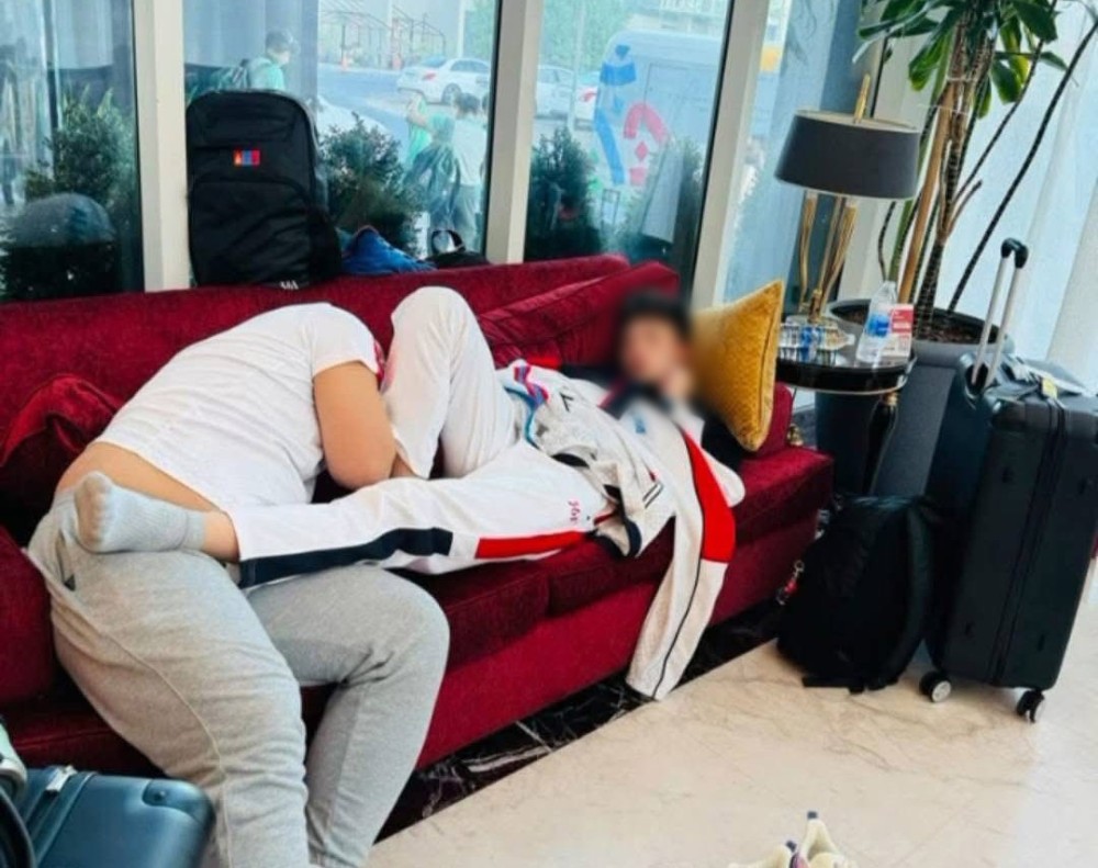 Тамирчид зочид буудлын үүдний хэсэгт, хаа таарсан газраа хоног төөрүүлж байна гэж багийн дасгалжуулагч, МУГТ Г.Отгонцэцэг мэдээлжээ.