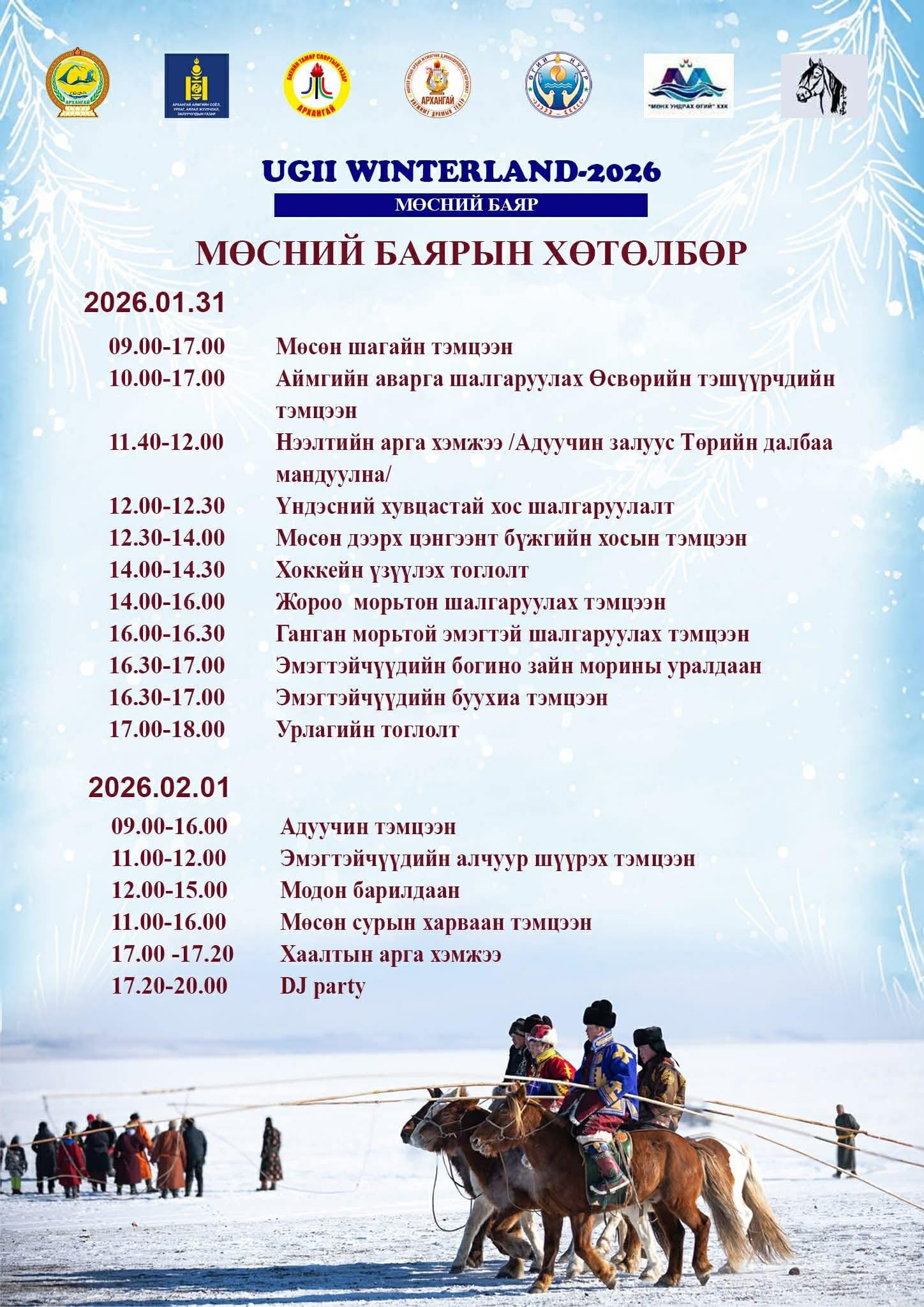 Архангай аймгийн Өгийнуур сумын нутагт орших Өгий нуурт “Ugii Winterland-2026” мөсний баяр нэгдүгээр сарын 31-ээс хоёрдугаар сарын 01-ний өдрүүдэд зохион байгуулагдана.