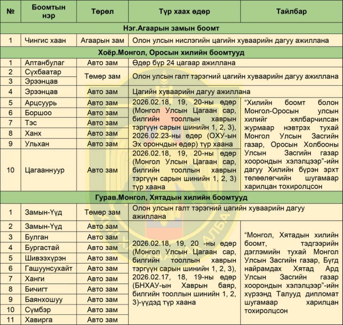 Монгол, Хятадын автозамын Замын-Үүд, Булган, Бургастай, Шивээхүрэн, Гашуунсухайт, Ханги, Бичигт, Баянхошуу, Сүмбэр, Хавирга боомтууд 2026.02.18, 19, 20-ны өдөр болон БНХАУ-ын Хаврын баяр билгийн тооллын шинийн 1, 2, 3-ны өдрүүдэд түр хаах юм байна.