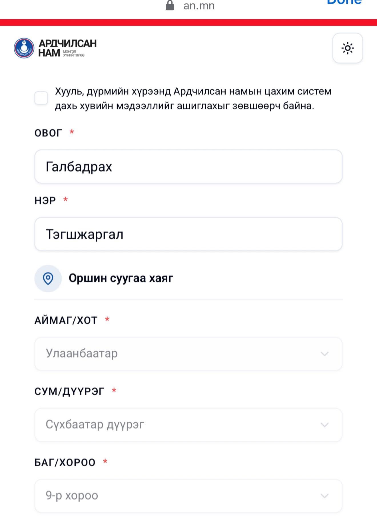 Ардчилсан намын сайтад нэвтэрч “Бүртгүүлэх” гэсэн цонх дээр дарж, регистрийн дугаараа бичихэд хувь хүний гэрийн хаягийн мэдээлэл гарч ирж байв. Энэ нь өнөөдөр шүүмжлэл дагууллаа.