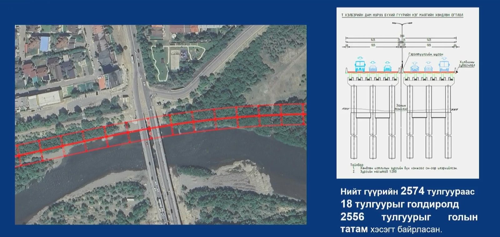 Нийт гүүрний 2,574 тулгуураас 18 тулгуурыг голдиролд 2,556 тулгуурын голын татам хэсэгт хийх аж. Төсөл хэрэгжүүлэгчийн зүгээс хэдхэн багана нь усан дотор байна бусад нь хамаагүй гэж бодож байвал алдаа болно гэдгийг тэрбээр онцлов.